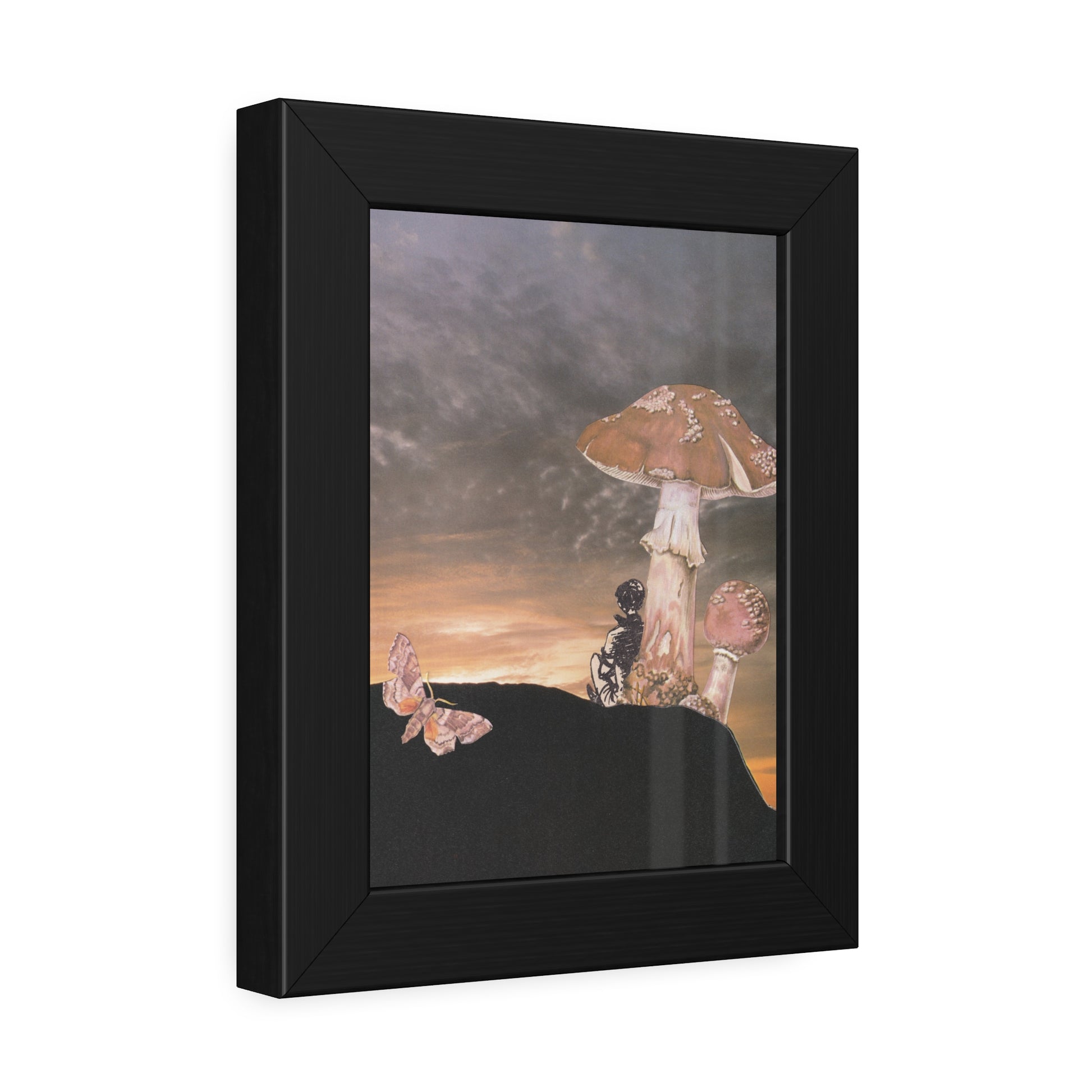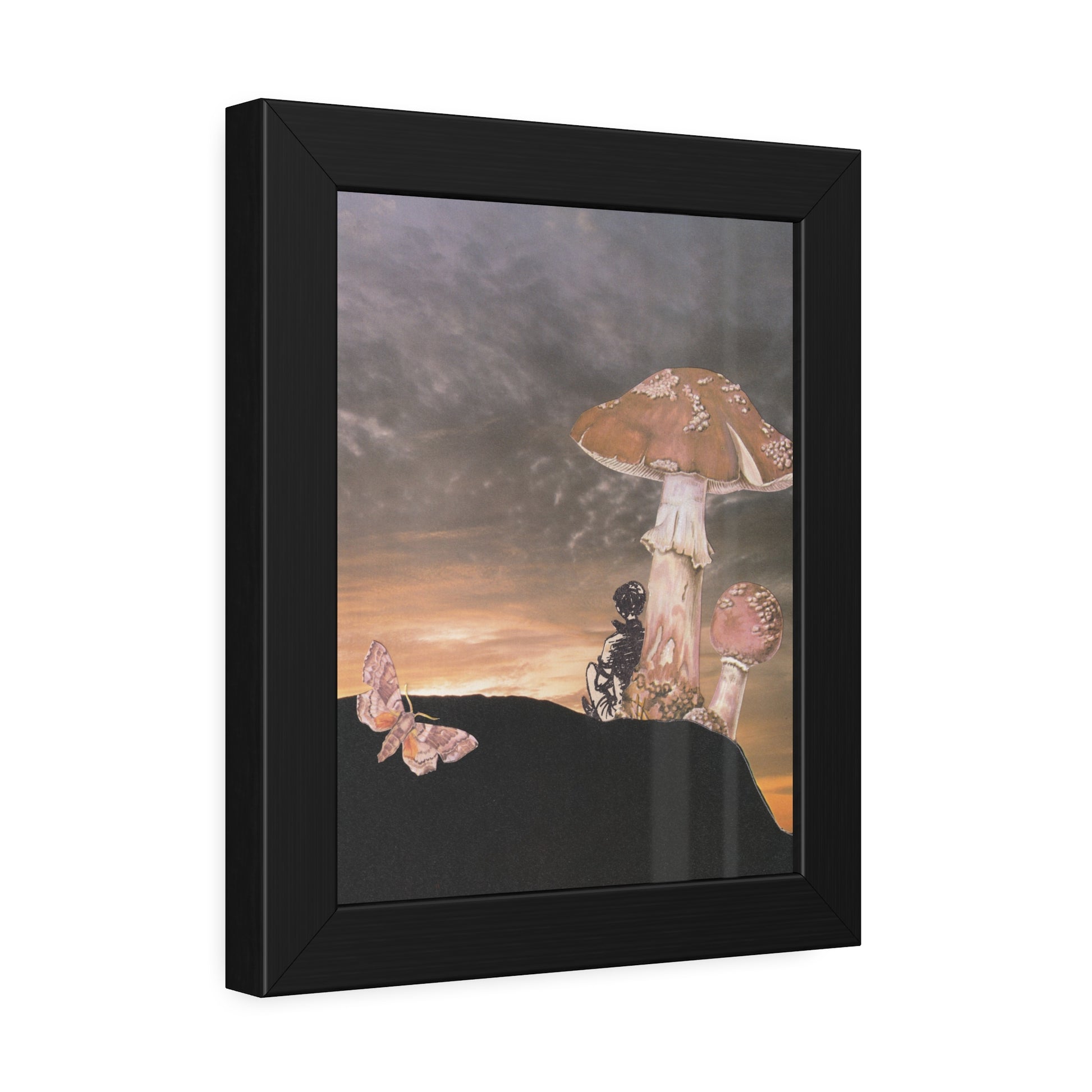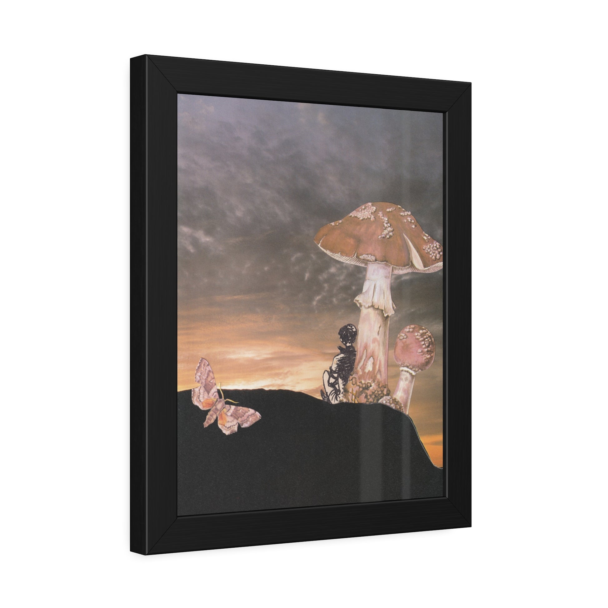 This art print, created from a handcrafted upcycled collage, tells a whimsical story of an introspective journey. Deeply absorbed in one's own thoughts, the gaze turns inward. Sheltered by mushrooms, one can linger peacefully on the rock and feel the comfort of nature.