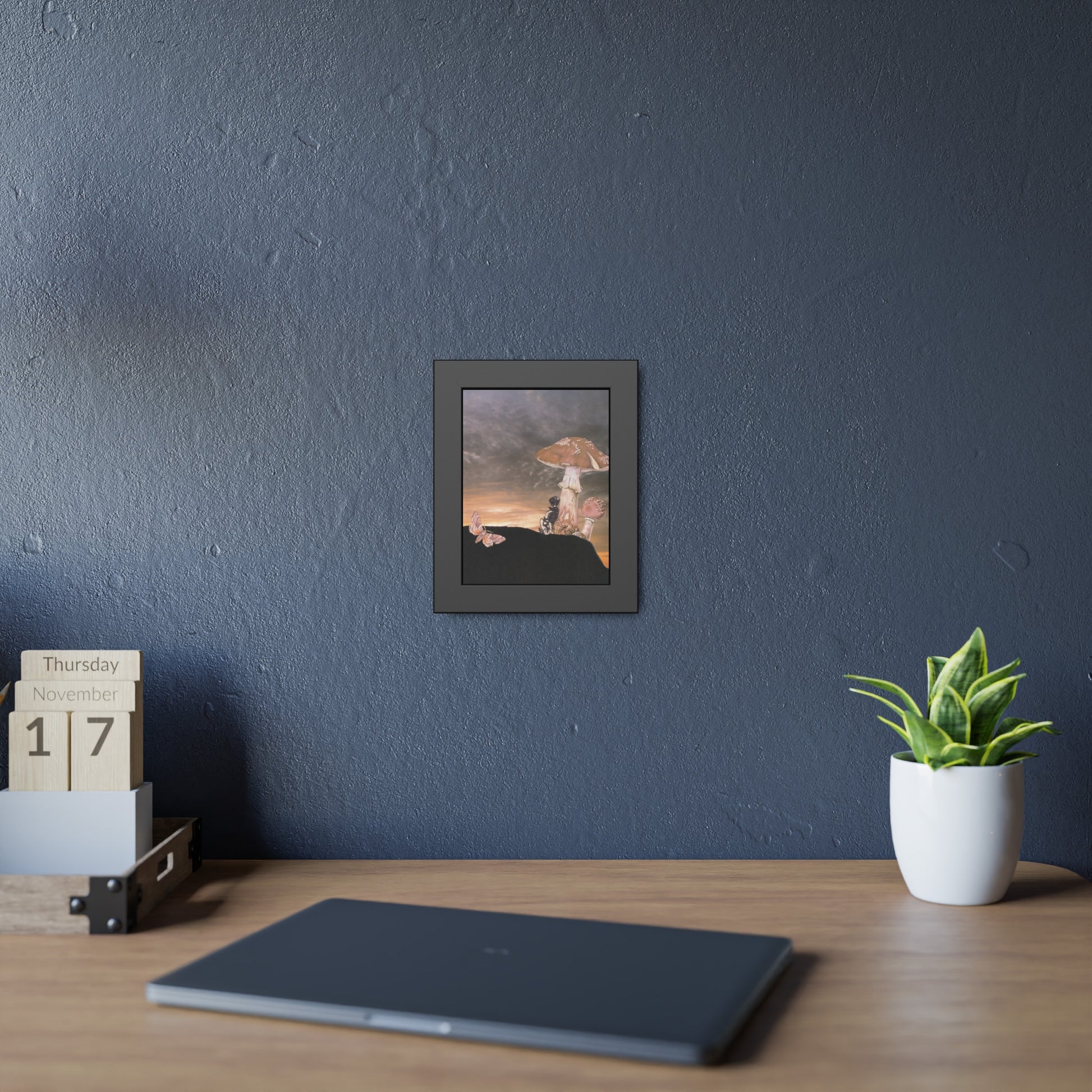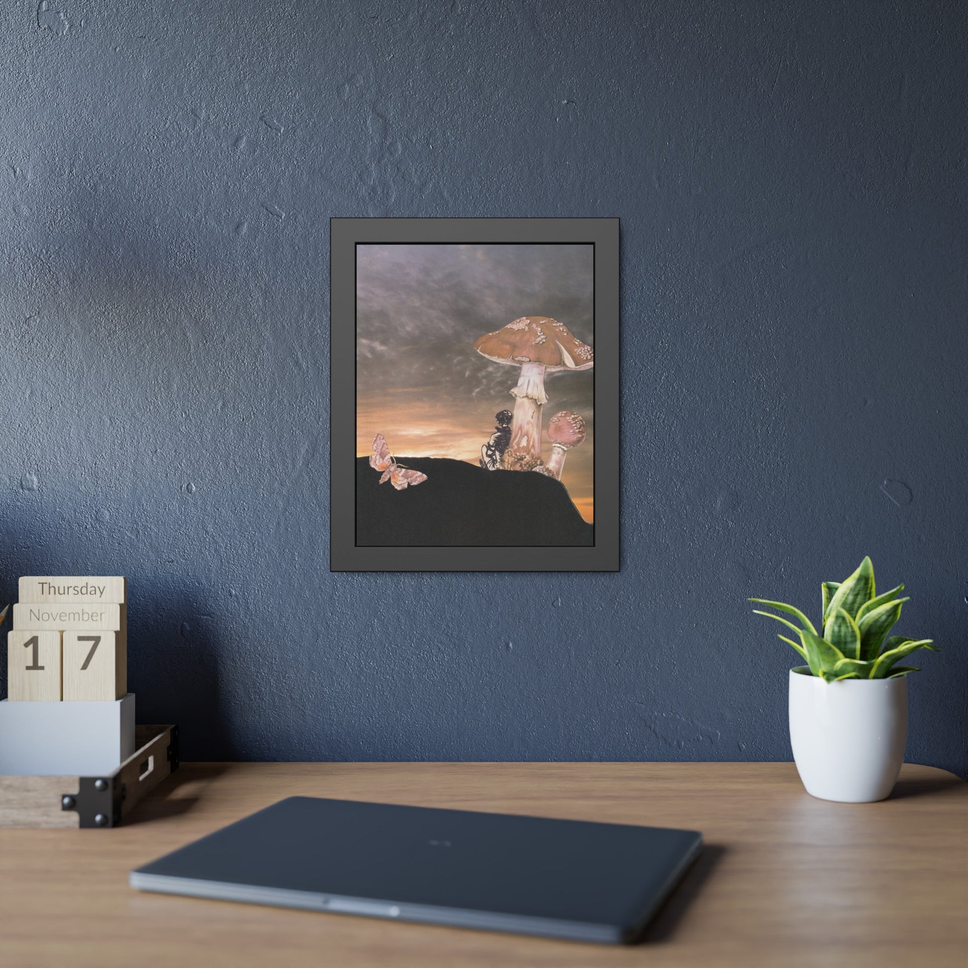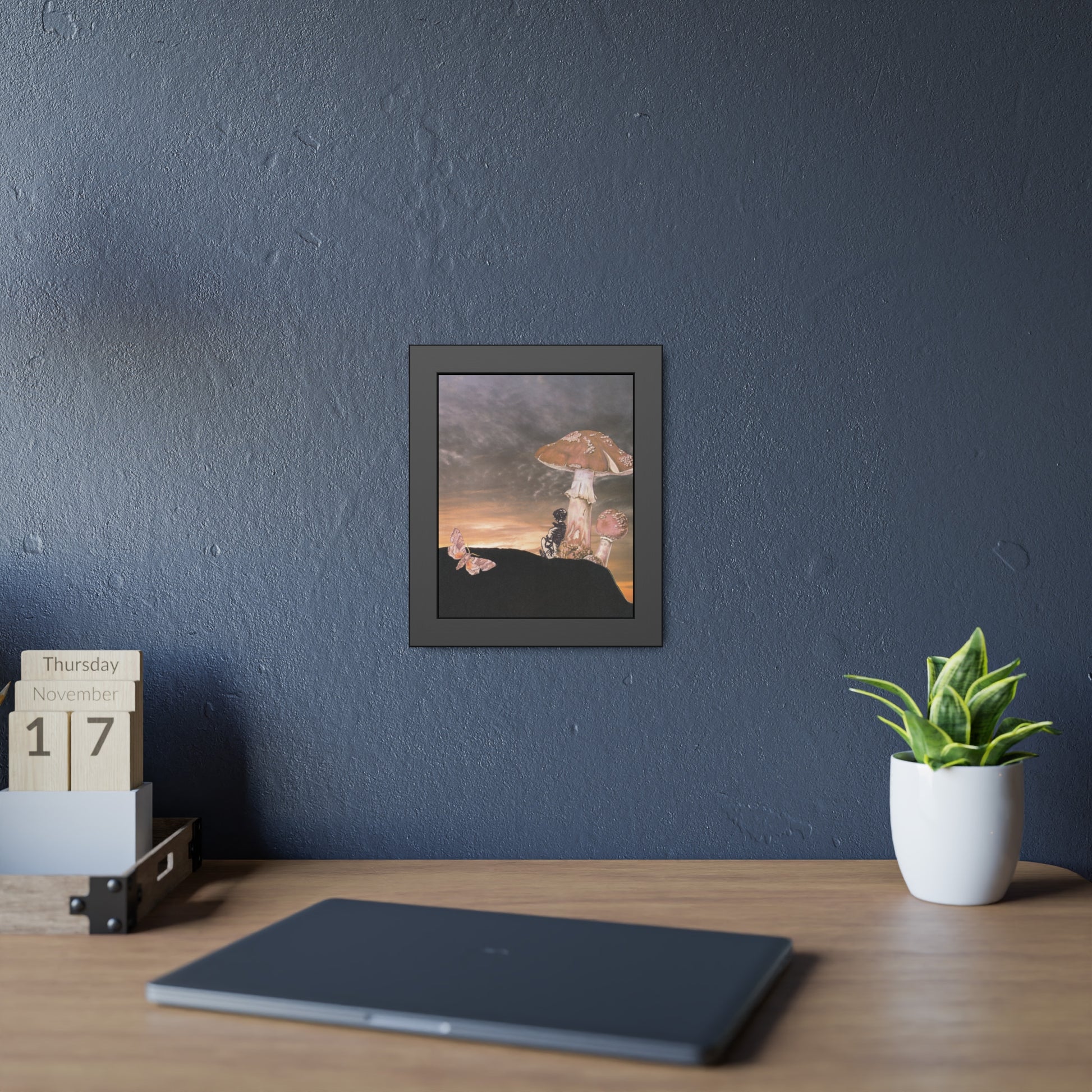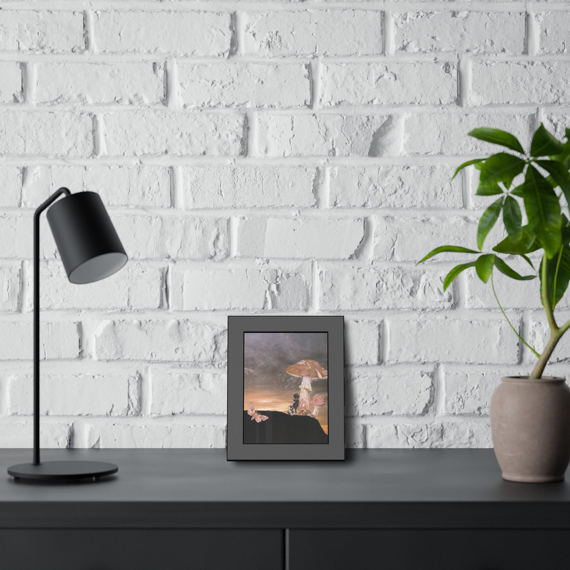 This art print, created from a handcrafted upcycled collage, tells a whimsical story of an introspective journey. Deeply absorbed in one's own thoughts, the gaze turns inward. Sheltered by mushrooms, one can linger peacefully on the rock and feel the comfort of nature.