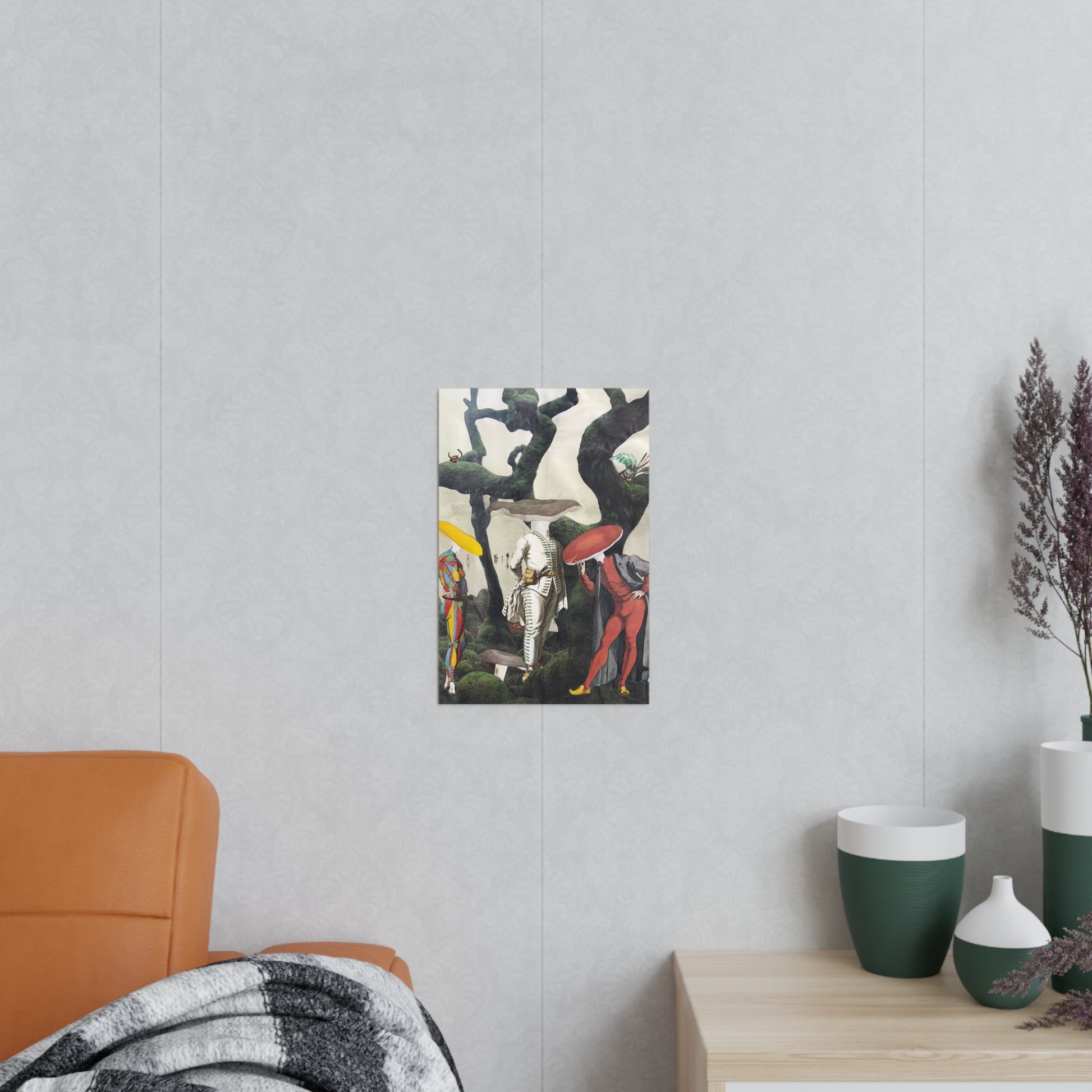 A photo paper poster that brings a captivating, surreal moment to your room. Soft shades of green and cream envelop the vintage figures. The 250 g/m² paper gives the artwork weight and presence on the wall, while your choice of satin or matte finish allows you to decide whether the colors pop or blend into a soft, tactile stillness. Hang it above a reading nook or bedside table to add a touch of whimsical nostalgia.