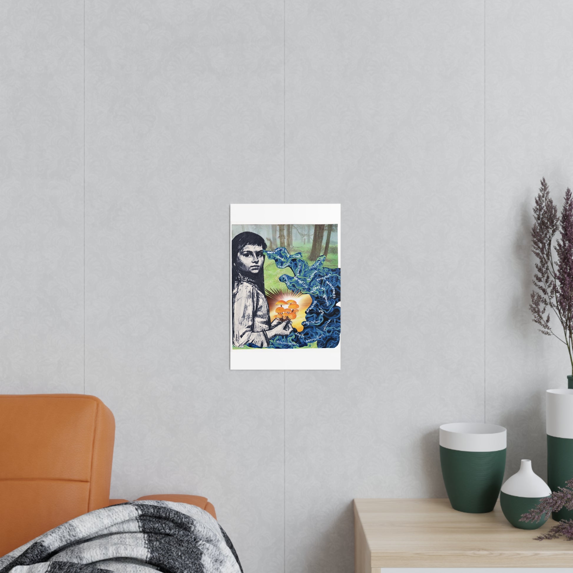Die Collage thematisiert die innere Welt und das mentale Wachstum, welches aus einer starken Haltung und Auseinandersetzung mit sich entstehen kann. Die Verbindung zwischen der Person, den Pilzen (oft ein Symbol für Transformation oder Vernetzung in der Natur) und den aufsteigenden Begriffen zeigen die Inspiration und Stärke, die aus einer tiefen Verbindung zur Natur oder dem Unterbewussten entspringen kann, auf.